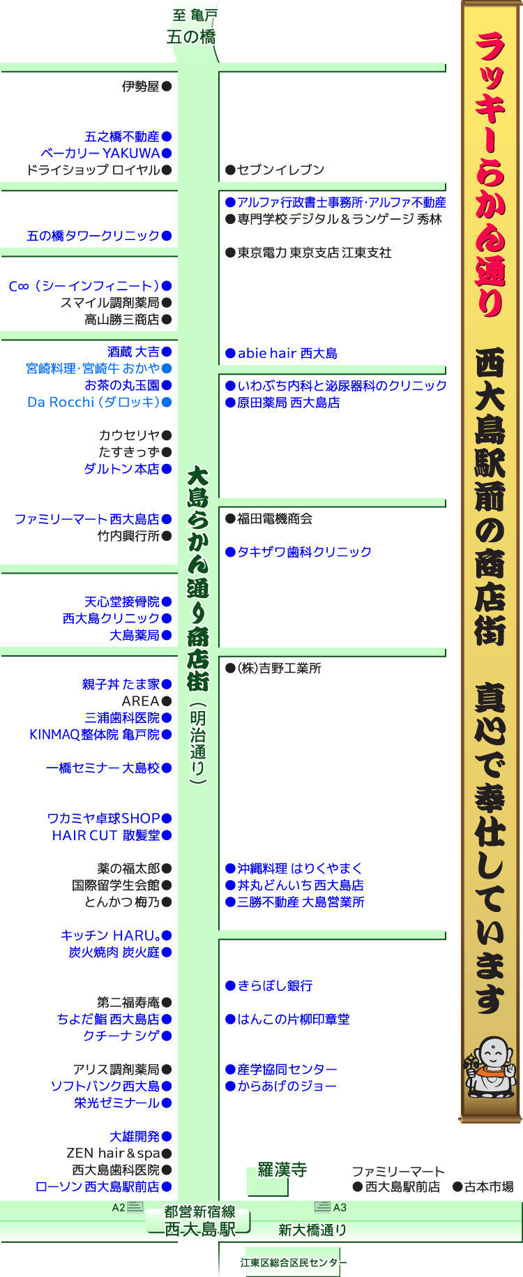 大島らかん通り商店街の各店舗の紹介です。営業時間や定休日などの店舗情報が確認できます。