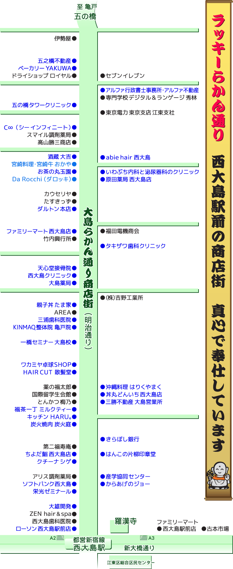 大島らかん通り商店街の各店舗の紹介です。営業時間や定休日などの店舗情報が確認できます。